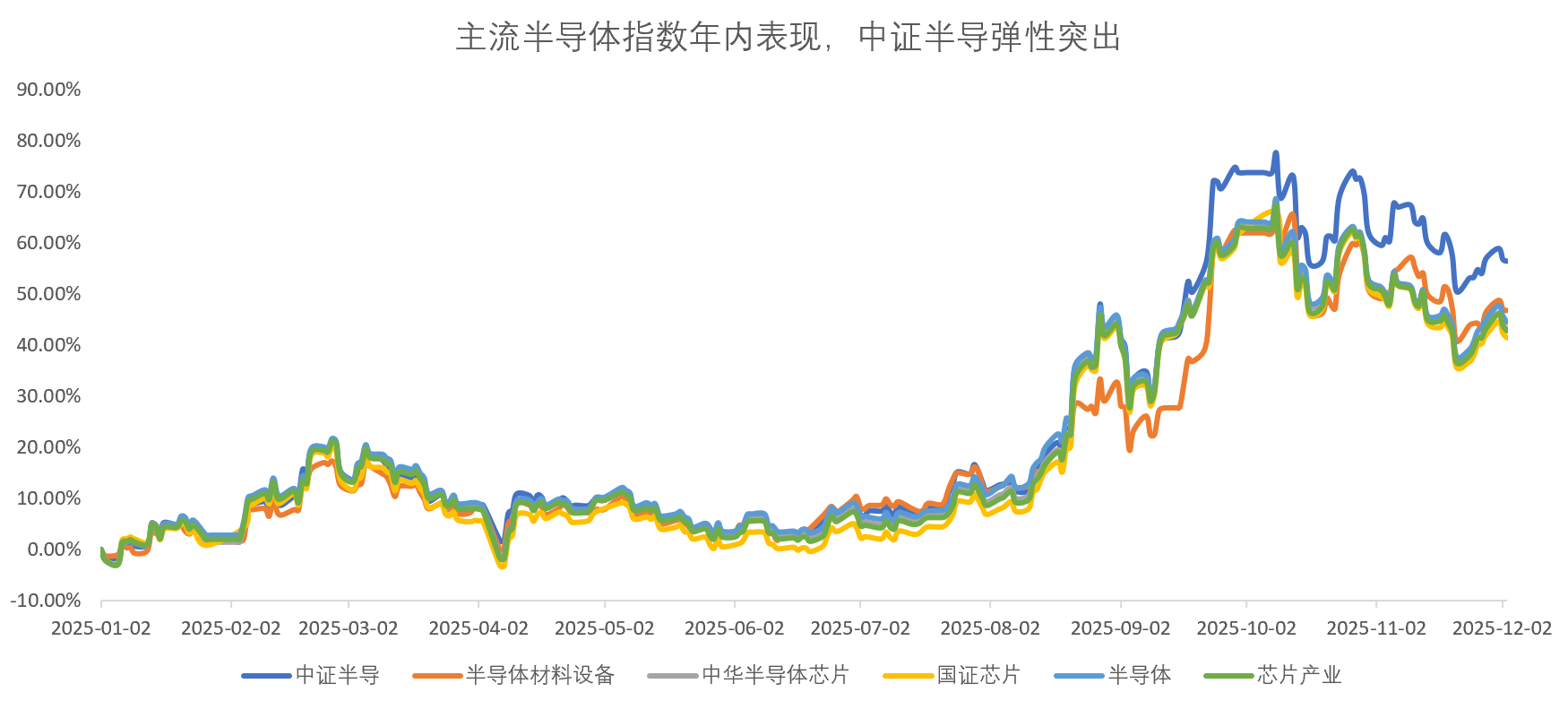 Wind数据显示,截至12月3日,中证半导2025年年内涨幅近50%,区间最大上涨超80%,年内涨跌幅在中证全指半导体、中华半导体芯片、国证芯片等主流半导体指数中位列第一。