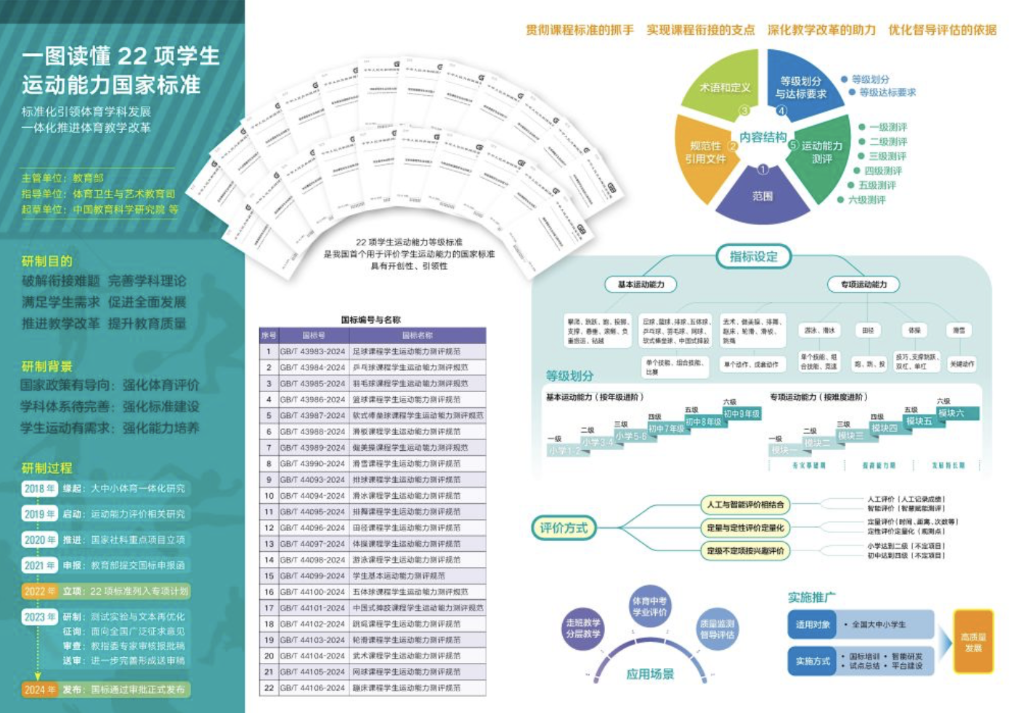 去年5月,由中国教育科学研究院牵头研制的22项《规范》发布,为中国学生运动能力等级提供了国家标准。这意味着长期困扰学校的运动能力评价无标准、课程缺乏衔接性问题,有望通过国家标准得以破解。